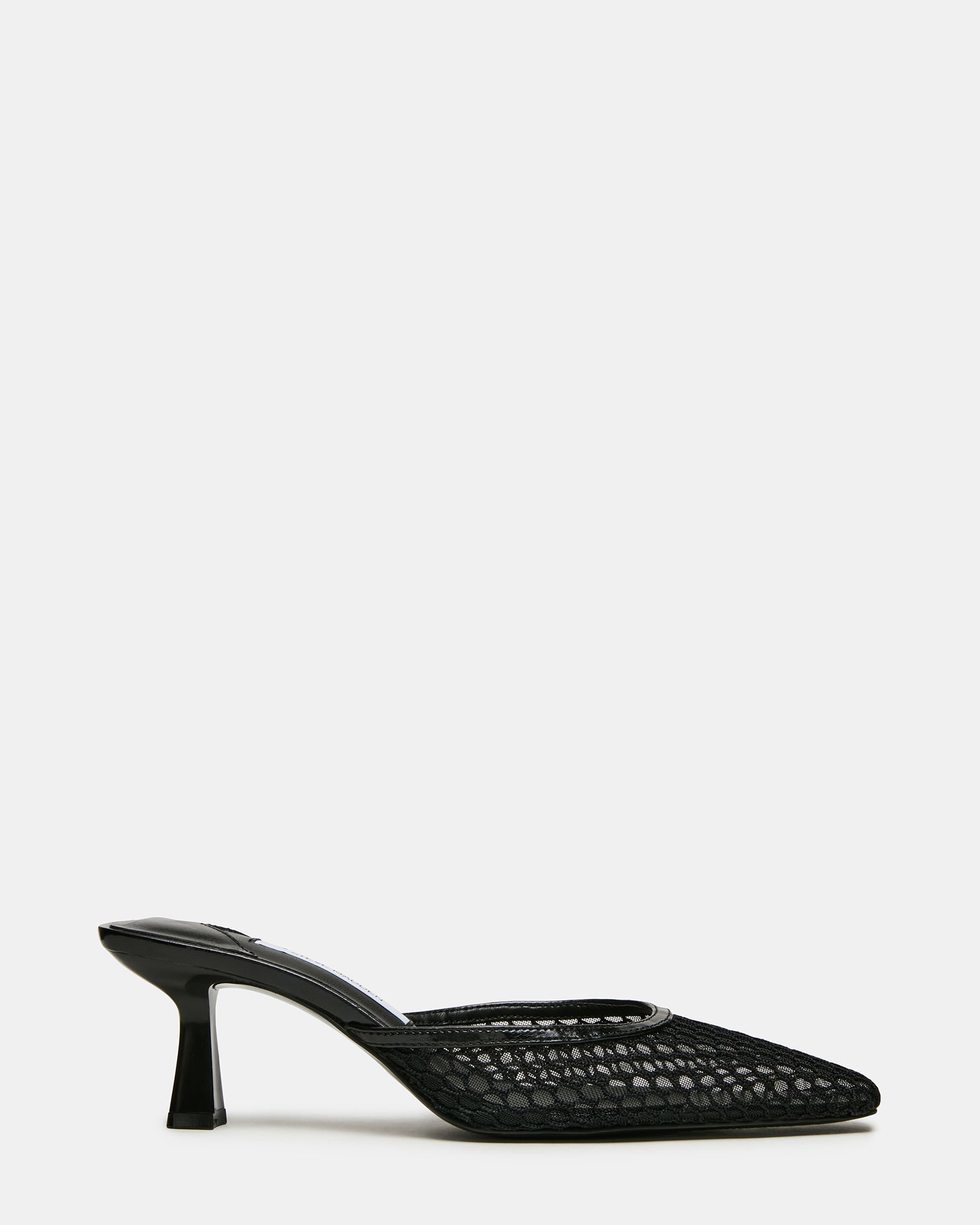 The ALYSE BLACK MESH square-toe mule delivers understated sophistication with its refined silhouette and kitten heel. This versatile style transitions seamlessly from office to evening. offering the comfort of a slip-on design without compromising on polish. The structured square toe provides a contemporary edge. while the delicate heel height ensures all-day wearability. An essential addition to any footwear collection.