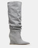 The DISTORTION boot features a scrunched design. wedge heel. and a pointed-toe. extending to knee height for a bold. fashion-forward silhouette. Crafted to combine edgy style with comfortable wear. this boot elevates any outfit with its sleek design and distinctive wedge support. Ideal for those seeking a statement piece that balances trend and practicality.