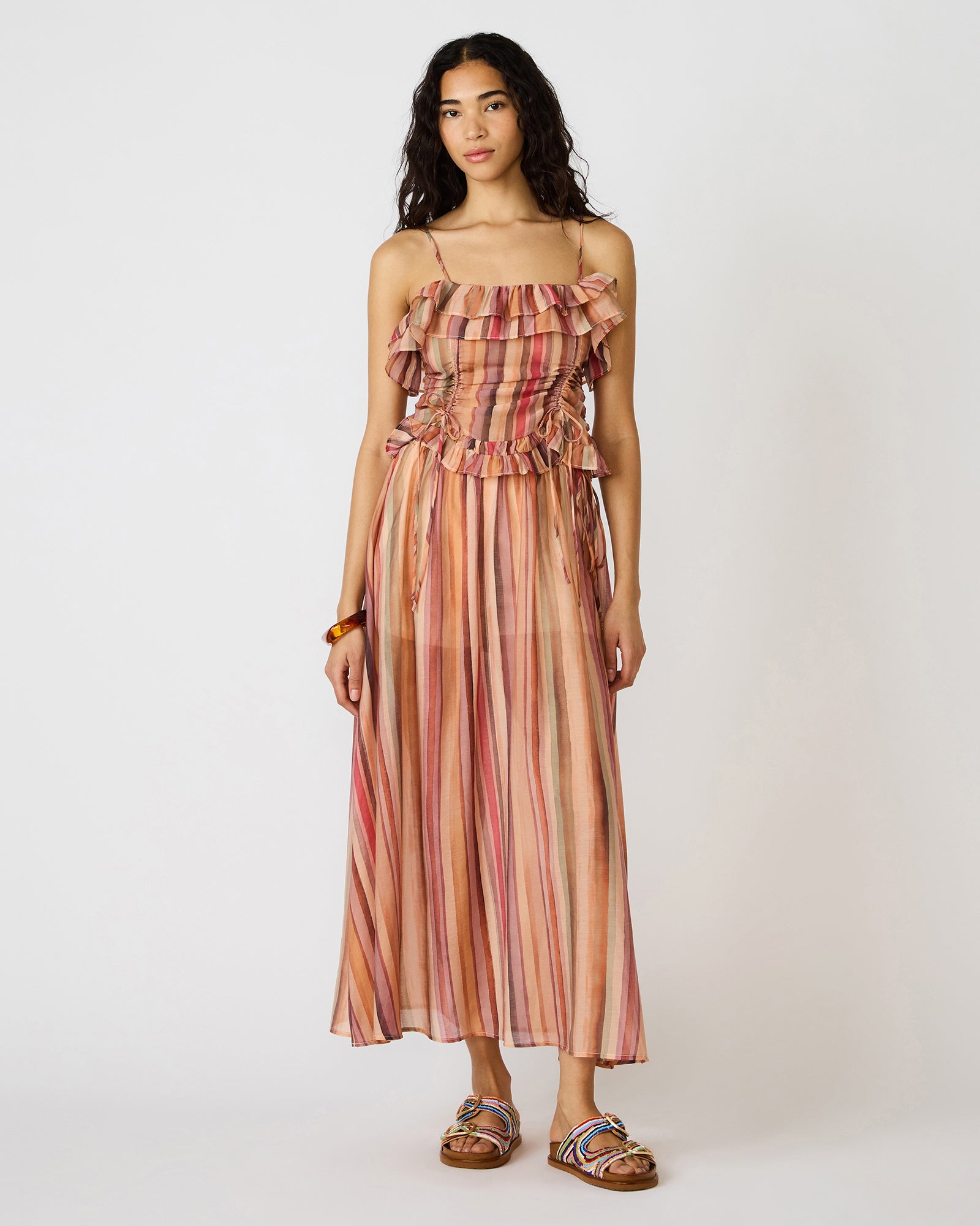 The SHILLOH TOP STRIPE MULTI combines contemporary design with playful details. This sleeveless silhouette features vibrant multi-colored stripes that create visual interest. while delicate ruffle accents add dimension and movement. The expert tailoring ensures a polished fit that transitions seamlessly from day to evening. Part of a coordinated set. it pairs effortlessly with matching pieces for a cohesive. intentional look. Perfect for those who appreciate thoughtful design elements and versatile styling options.